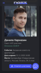2. После сканирования QR-кода откроется билет участника. На нем вы сможете увидеть фамилию и имя участника, фото его профиля, название пакета участия, информацию о цене участия, название мероприятия, дату и время, а также место проведения.