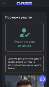 3. Убедитесь, что внизу билета участника есть кнопка «Отметить участника». Если ее нет, то билет либо уже был использован ранее (в этом случае на нем будет большая зеленая метка, что «Участник уже был отмечен»), либо билет поддельный.